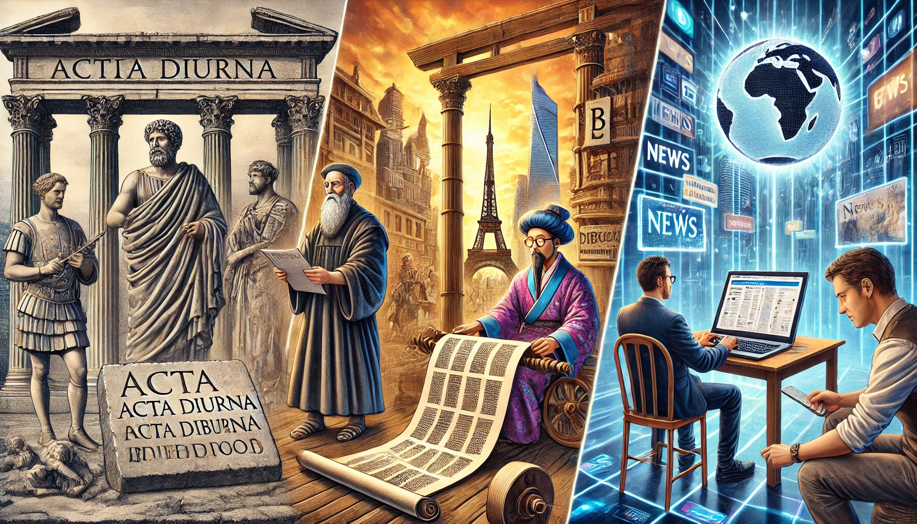 Pada tahun 59 SM, Kekaisaran Romawi memperkenalkan Acta Diurna, papan pengumuman publik yang dipahat di batu atau logam dan dipajang di tempat umum. Papan ini menjadi “koran dinding” pertama yang mengabarkan keputusan senat hingga gosip warga.