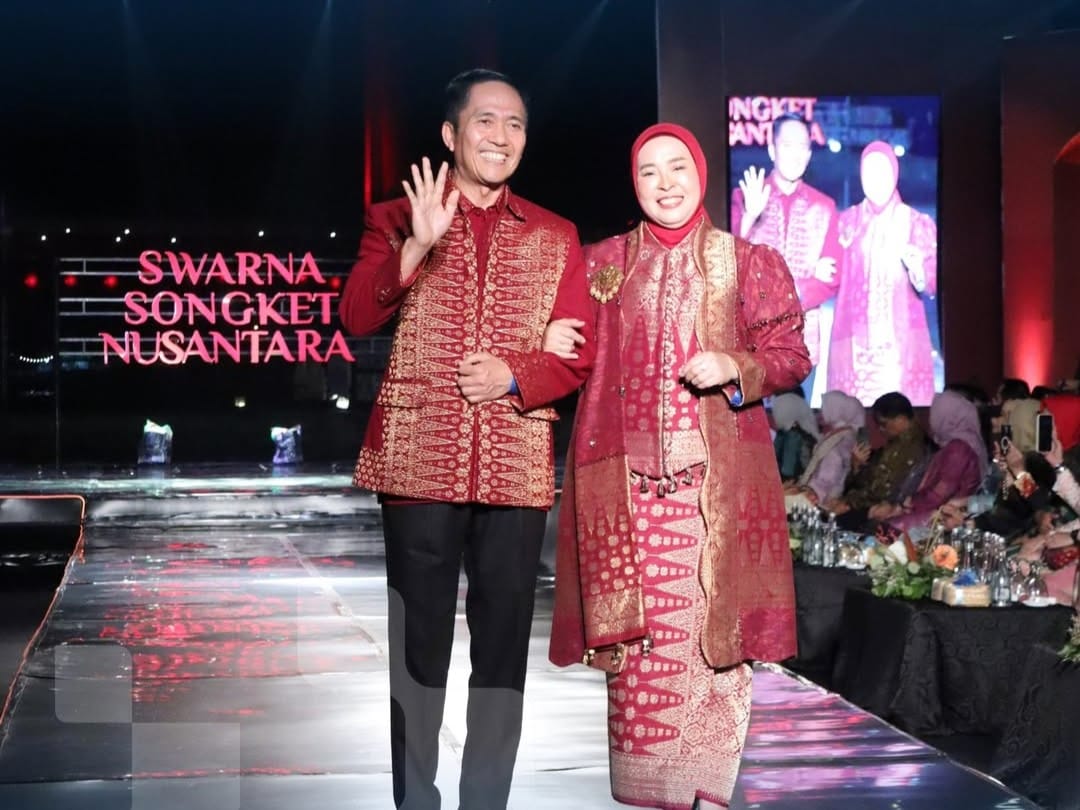 Gunakan Songket Bunga Tanjung, Walikota Palembang dan Istri Pukau Panggung Swarna Songket Nusantara 2025