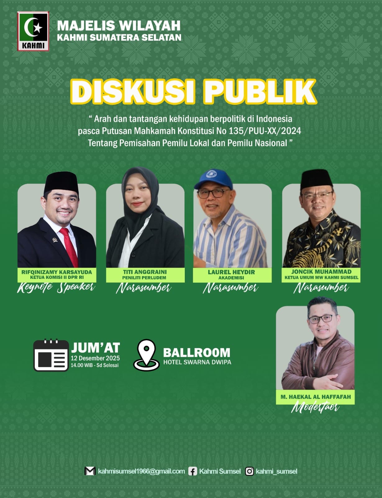 Update Kini, Palembang — Majelis Wilayah Korps Alumni HMI (KAHMI) Sumatera Selatan menggelar Diskusi Publik dengan tema “Arah dan Tantangan Kehidupan Berpolitik di Indonesia Pasca Putusan Mahkamah Konstitusi No. 135/PUU-XX/2024 Tentang Pemisahan Pemilu Lokal dan Pemilu Nasional”. Acara ini berlangsung pada Jumat (12/12/2025) di Ballroom Hotel Swarna Dwipa, Palembang, mulai pukul 14.00 WIB hingga selesai.