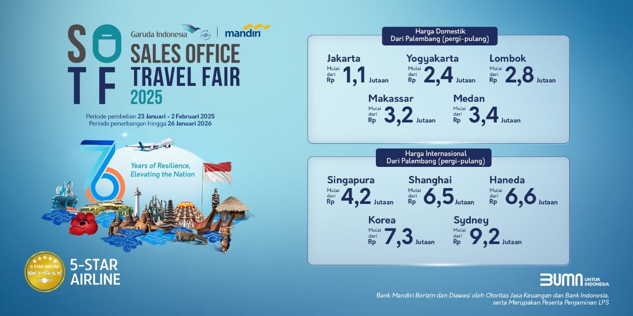 Jakarta, UpdateKini – Garuda Indonesia, maskapai penerbangan nasional, resmi menggelar Sales Office Travel Fair (SOTF) 2025 mulai 23 Januari hingga 2 Februari 2025. Acara ini menjadi bagian dari perayaan HUT ke-76 Garuda Indonesia yang jatuh pada 26 Januari 2025. Berkolaborasi dengan Bank Mandiri sebagai mitra perbankan, program ini bertujuan mendukung akselerasi sektor pariwisata nasional sekaligus memberikan penawaran tiket penerbangan dengan harga menarik.