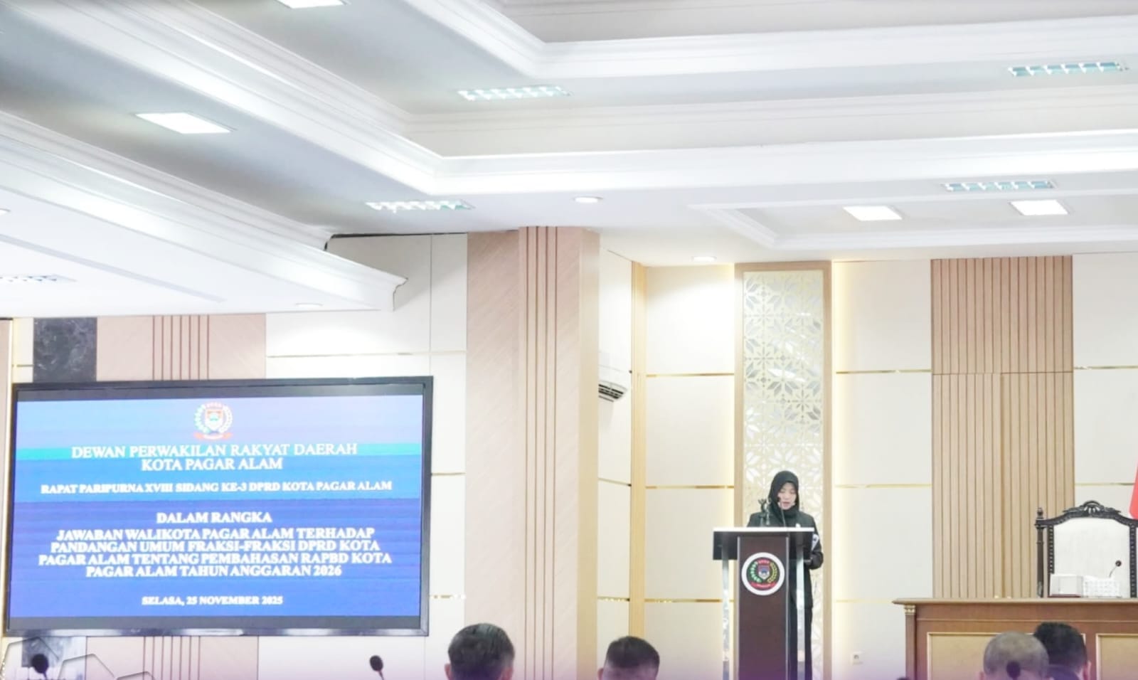 Updatekini.com Pagar Alam -Pada Rapat Paripurna XVIII Sidang Ke-3 DPRD Kota Pagar Alam, Wakil Wali Kota Pagar Alam Bertha sampaikan jawaban Wali Kota Pagar Alam atas pandangan umum fraksi-fraksi DPRD Kota Pagar Alam terkait Rancangan Anggaran Pendapatan dan Belanja Daerah (APBD) Kota Pagar Alam tahun 2026, di ruang Sidang Utama DPRD Kota Pagar Alam Selasa (25/11/2025).