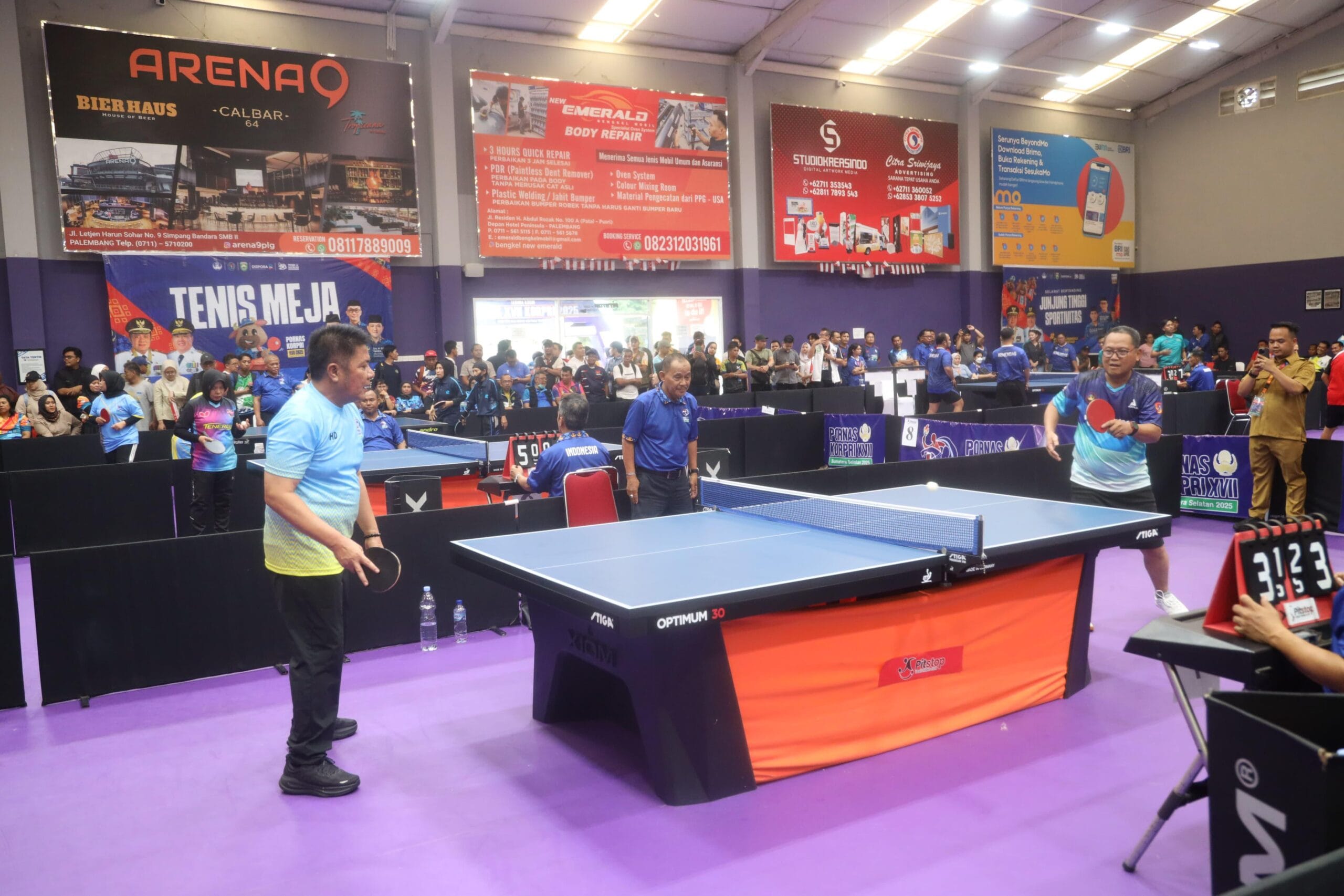 Updatekini.Com, Palembang – Suasana penuh keakraban dan sportivitas mewarnai laga tenis meja kategori Kepala Daerah (Fun Game) dalam rangka Pekan Olahraga Nasional (PORNAS) XVII KORPRI Tahun 2025 di Palembang. Gubernur Sumatera Selatan H. Herman Deru turun langsung bertanding melawan Bupati Gorontalo Utara, Thariq Modanggu, di PITSTOP Xiom Table Tennis Center, Senin (6/10/2025).
