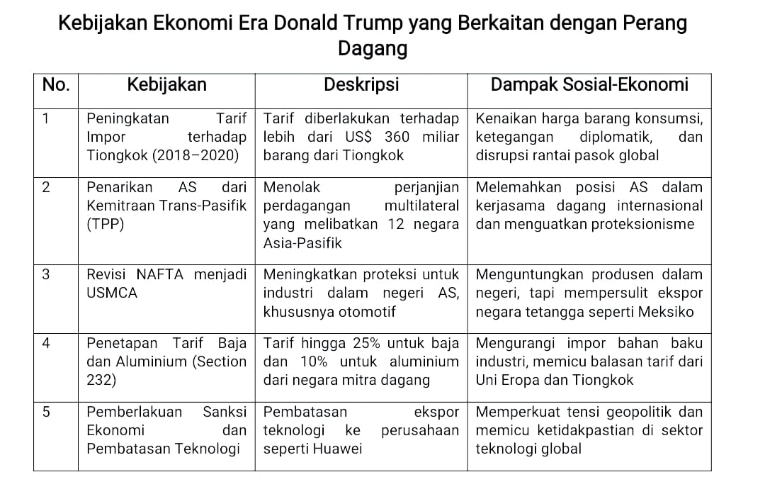 Kebijakan-kebijakan mana mencerminkan pendekatan ekonomi nasionalistik yang berdampak luas terhadap struktur sosial-ekonomi global, terutama di negara-negara yang sangat bergantung pada perdagangan luar negeri. Dalam konteks ini, kajian mengenai alternatif sistem ekonomi berbasis nilai sosial menjadi semakin penting untuk memahami ketahanan sosial masyarakat terhadap tekanan eksternal semacam ini. Untuk memperjelas arah kebijakan ekonomi pemerintahan Trump yang relevan terhadap isu perang dagang, berikut disajikan ringkasan beberapa kebijakan kunci dan dampaknya: