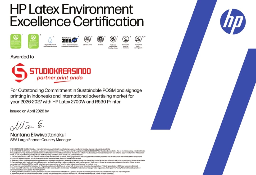 Teknologi HP Latex dikenal sebagai inovasi mutakhir dalam dunia digital printing yang menawarkan hasil cetak berkualitas tinggi, warna tajam, serta daya tahan luar biasa. Tidak hanya itu, teknologi ini juga menggunakan tinta berbasis air yang lebih aman, tidak berbau menyengat, serta ramah lingkungan—menjadi pilihan ideal bagi kebutuhan indoor maupun outdoor.