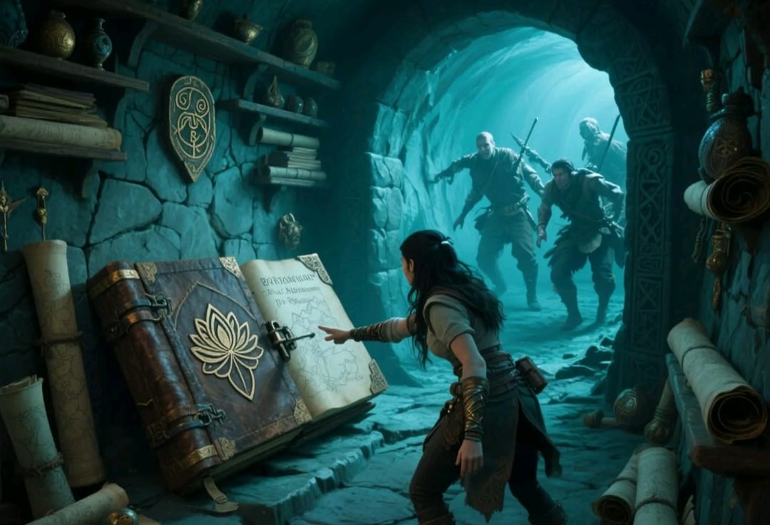 In an alcove, partially covered by a stone slab, lay a wooden chest. Inside, the manuscript rested, bound in worn leather with the symbol of Bertarian—a lotus surrounded by geometric patterns.