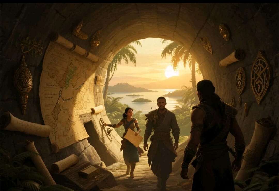 The tunnel led to a vast underground chamber bathed in a faint golden glow. Scrolls, maps, and artifacts revealed the complexity of trade, alliances, and political strategies spanning islands and kingdoms.