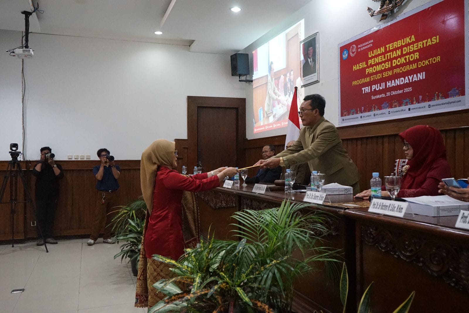 Surakarta, Updatekini – Sidang terbuka promosi doktor di Program Studi Seni, Program Doktor Pascasarjana Institut Seni Indonesia (ISI) Surakarta telah berlangsung dengan lancar pada Senin, 20 Oktober 2025, pukul 13.00 hingga 16.00 WIB. Sidang ini menjadi momen bersejarah bagi Tri Puji Handayani (NIM 213121003) yang berhasil mempertahankan disertasi berjudul “Dinamika Estetika Teater Dulmuluk di Palembang Sumatera Selatan (1974–2024)” dan resmi dikukuhkan sebagai Doktor Pengkajian Seni.